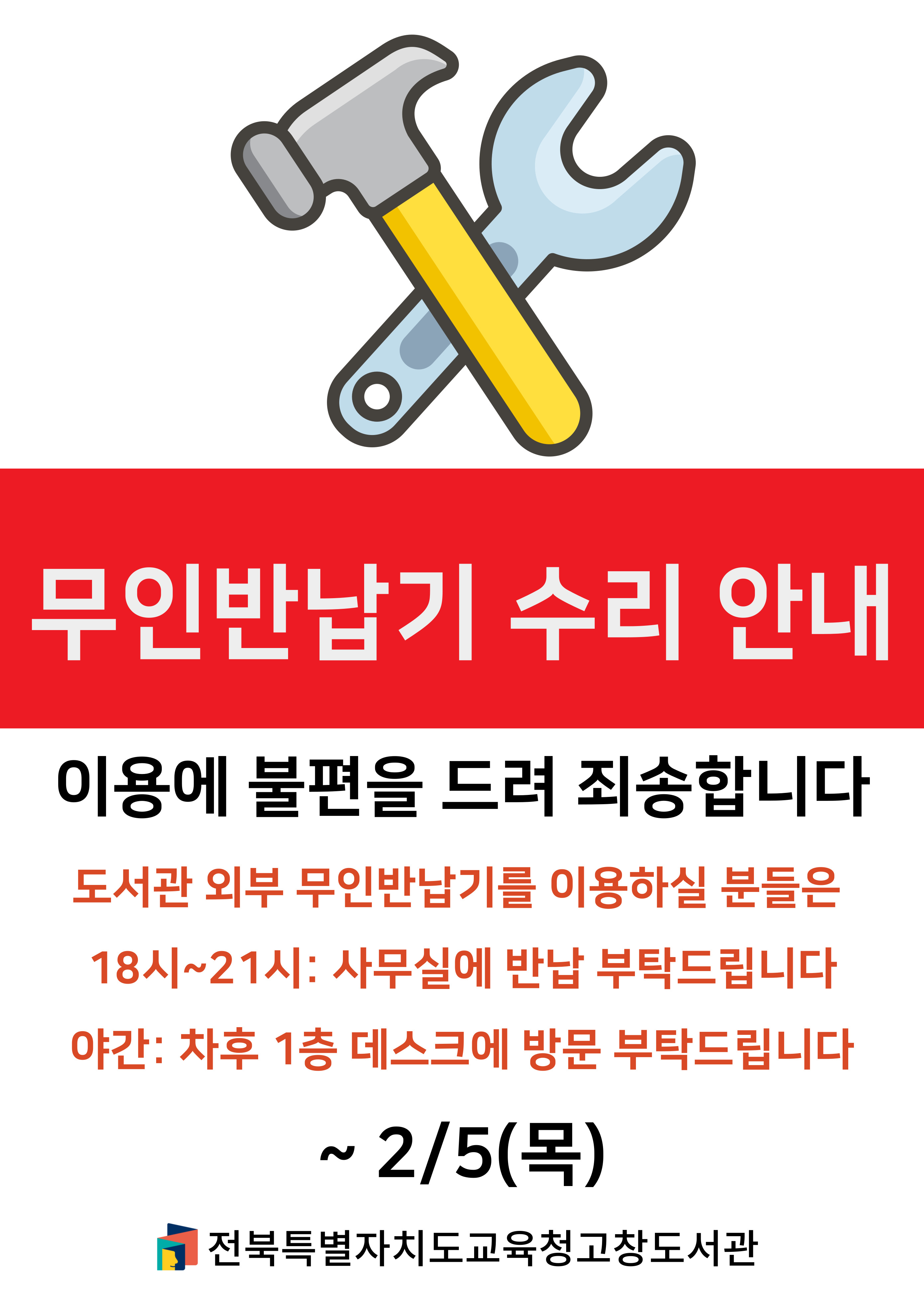 [안내] 도서관 외부 무인반납기 이용 불가(~2.5.(목) 15시)