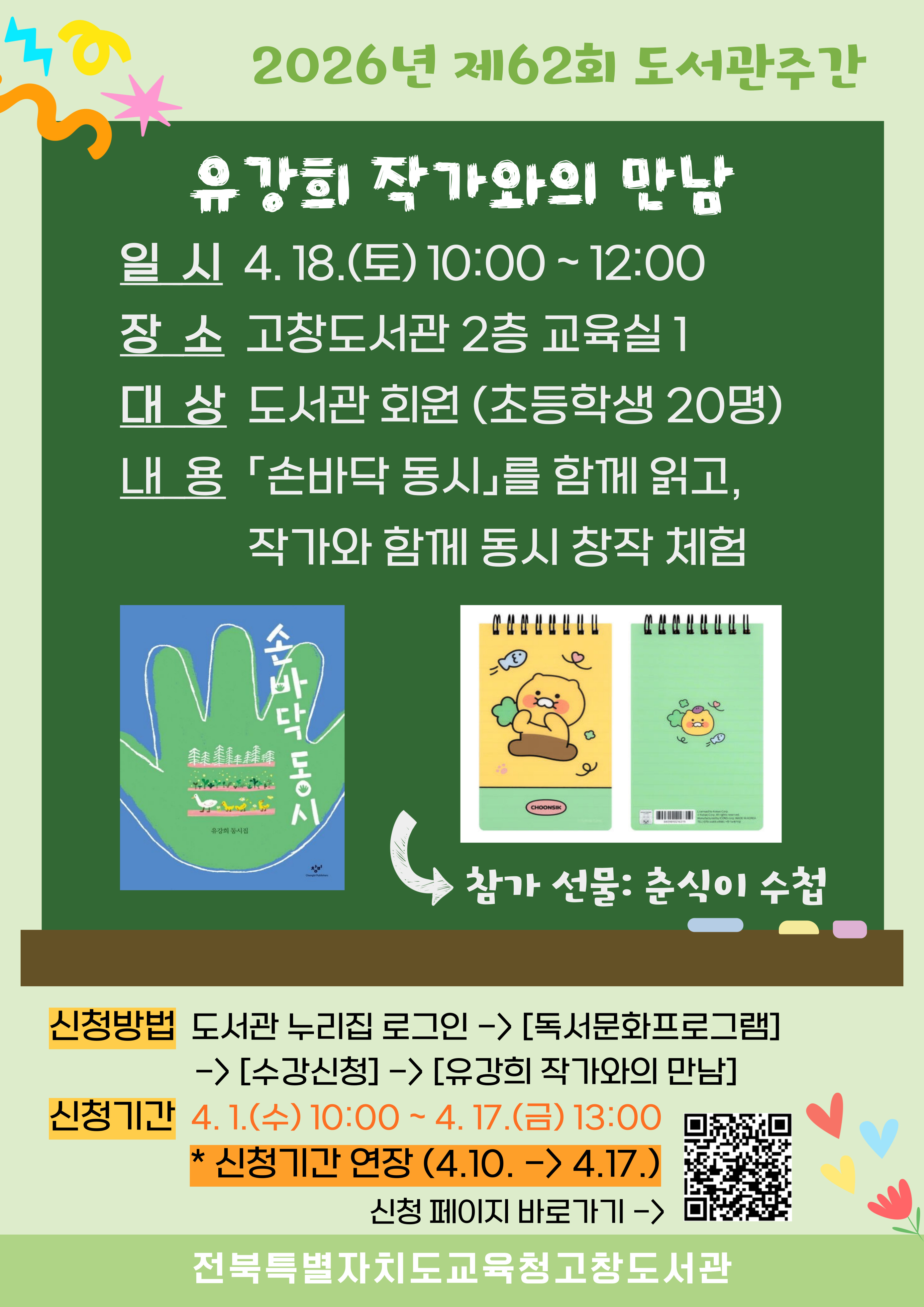 도서관주간 작가와의 만남 행사 참가자를 추가모집중이오니 이용자 여러분의 많은 참여 부탁드립니다.