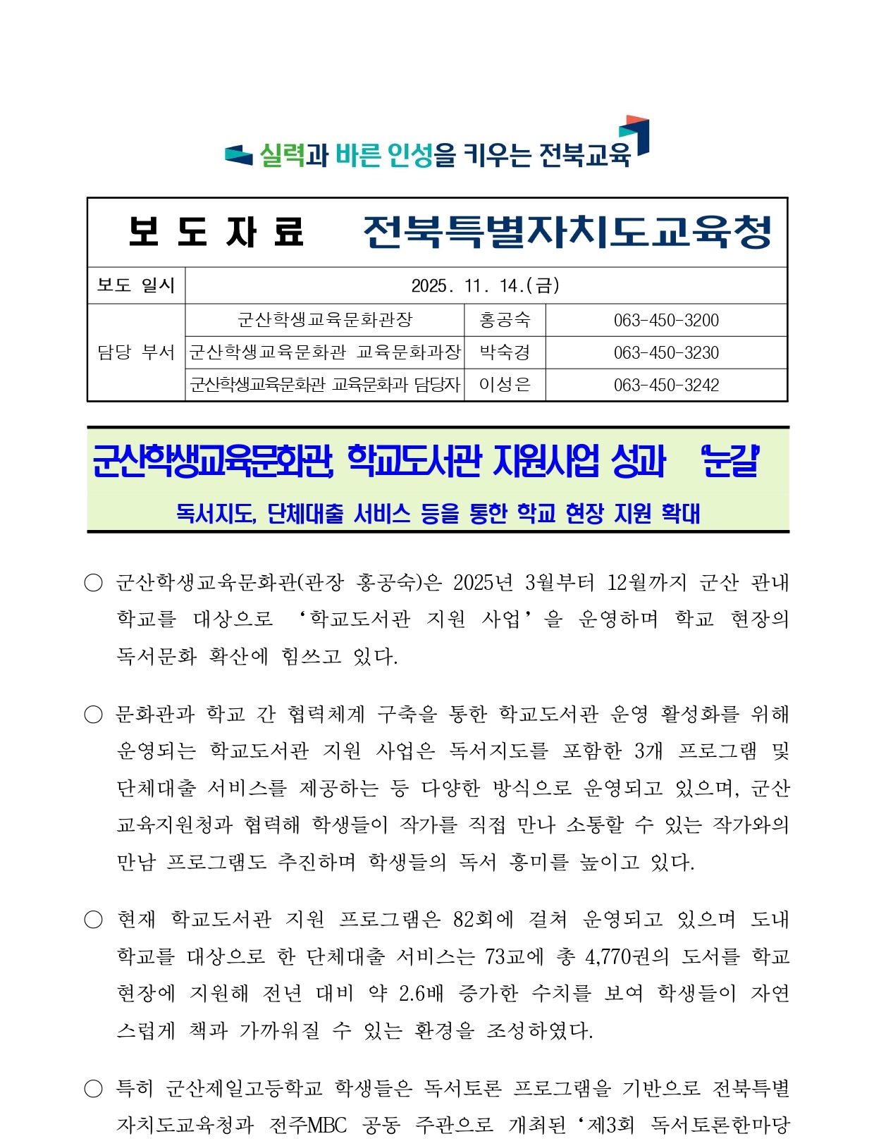 - 군산학생교육문화관, 학교도서관 지원사업 성과 ‘눈길’