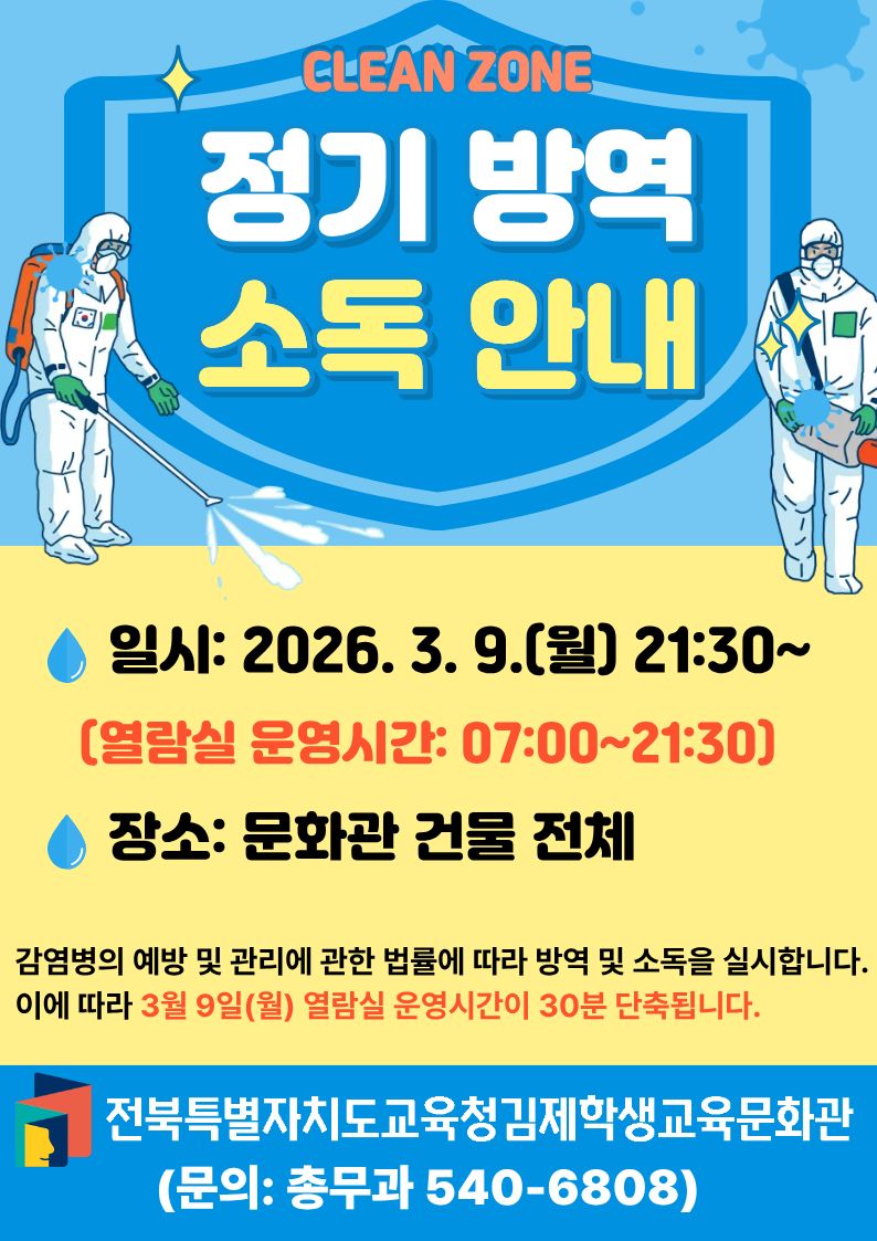 3월 정기 방역 소독 실시로 인해 3. 9.(월) 열람실 운영시간이 기존보다 30분 단축 운영됩니다.