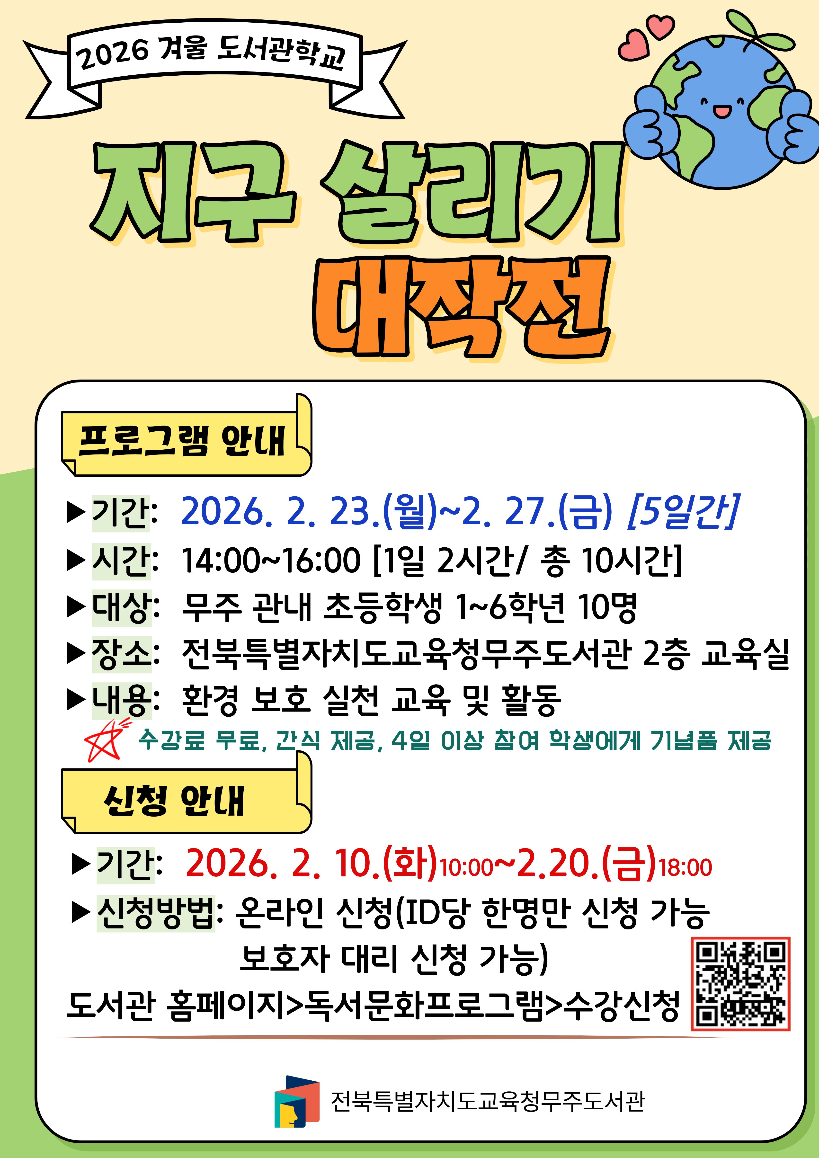 전북특별자치도교육청무주도서관에서 겨울방학을 맞이하여 2026년 겨울 도서관학교 <지구 살리기 대작전>을 운영합니다.